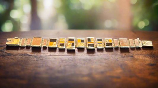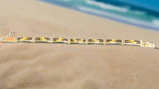 Native Earth link bracelet with Seven links. It has Picture Jasper, Tigers Eye, and Black Jade. Made by Super Smith Inc.