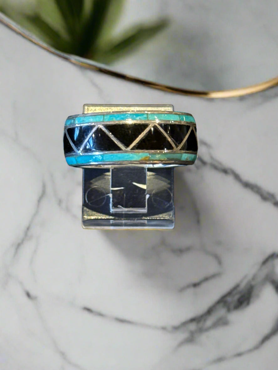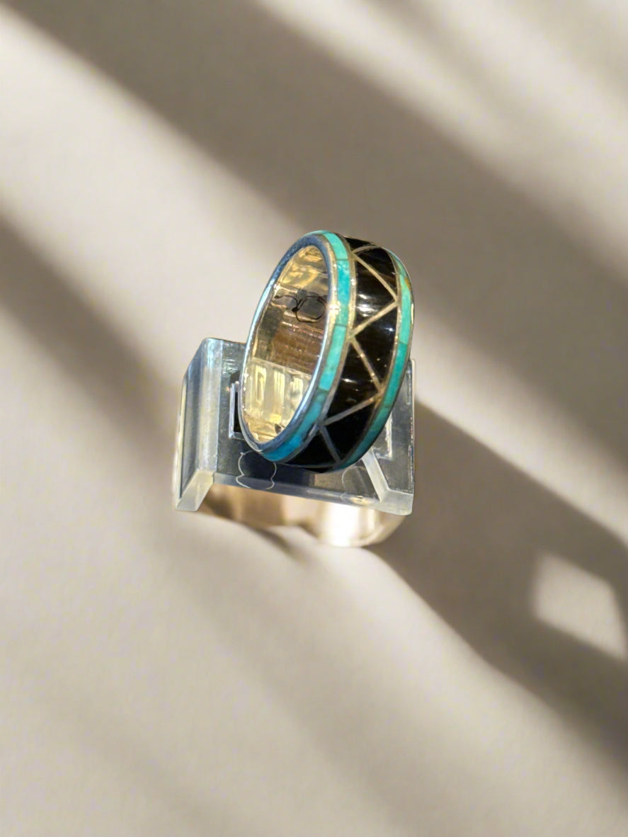 This elegant black jade ring by Super Smith adorned with a turquoise stone exudes a sense of exclusivity. The intricate design and luxurious materials make this ring a standout accessory for any occasion. Elevate your style with this unique piece of art.