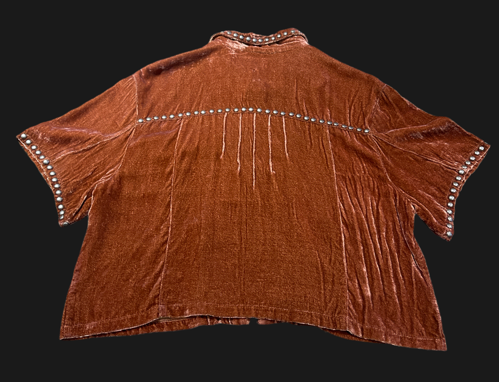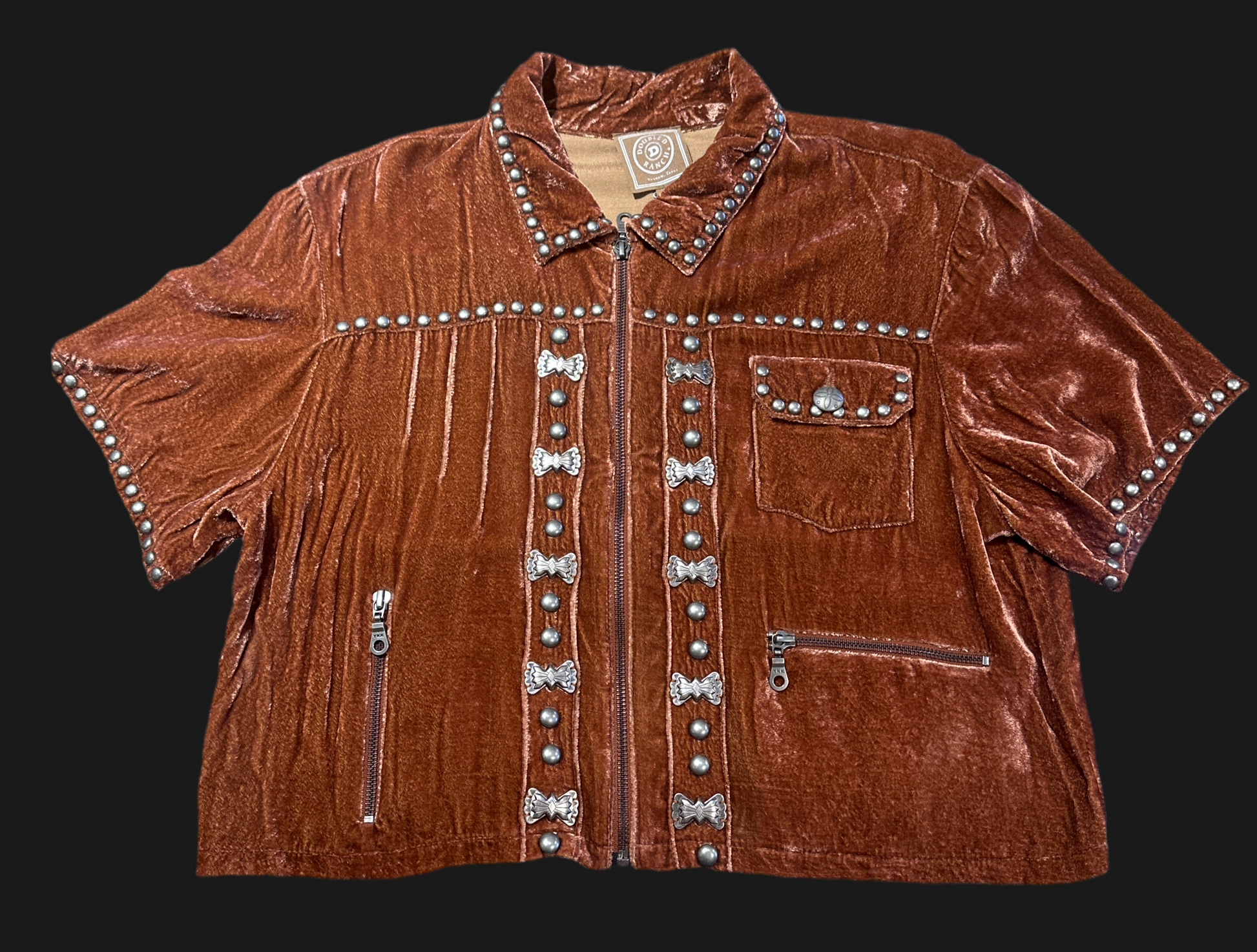 Experience the luxurious feel of velvet with this sophisticated short-sleeved silhouette. Featuring a cropped cut and a classic collar, it can be worn as both a top and a jacket over any ensemble. The subtle zip front adds a touch of edginess, while the classic studding and custom conchos enhance the cowgirl aesthetic.