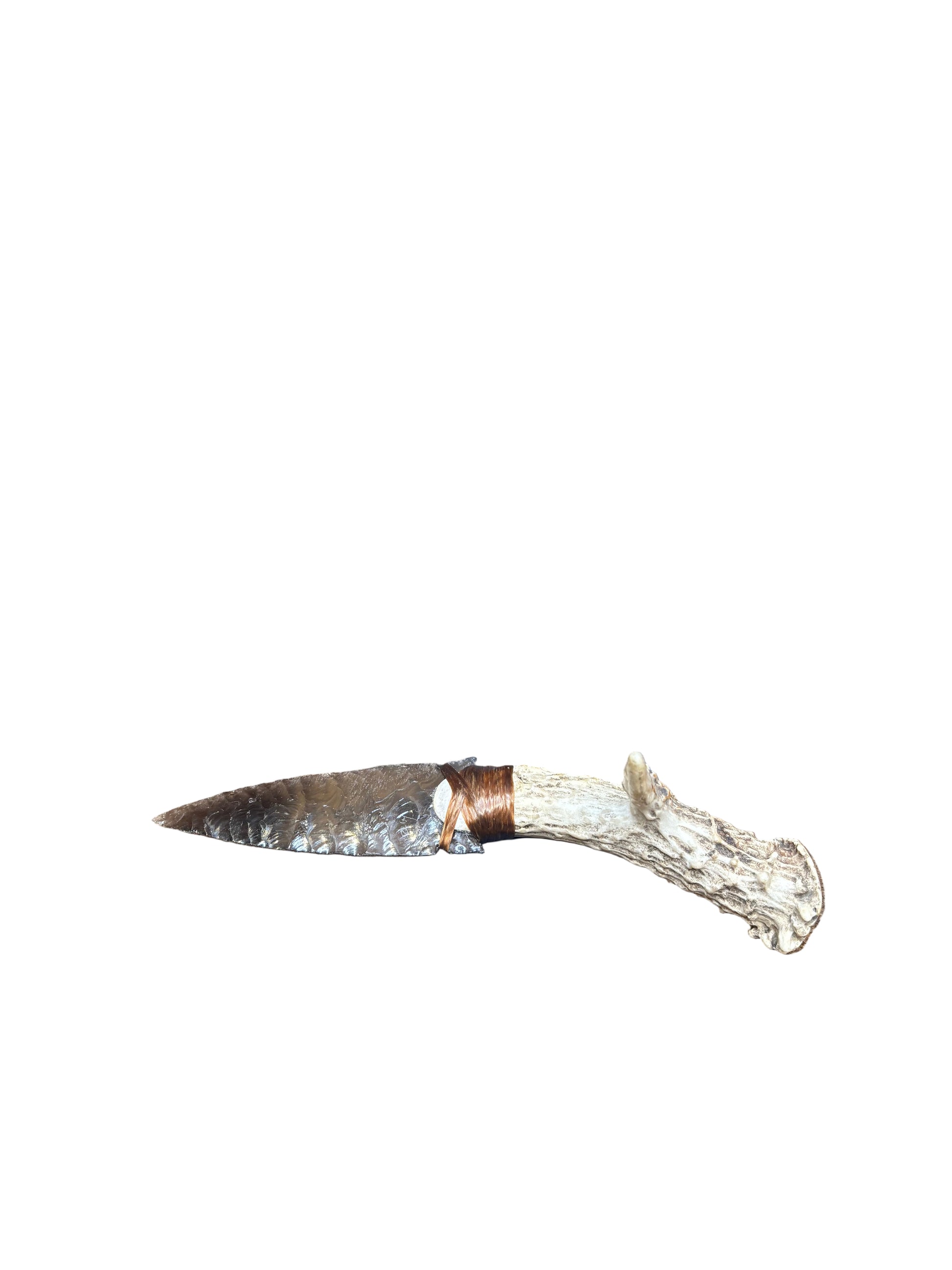 Designed and created by Dale Duby of Great Basin Art. These knives are flintnapped stone knives. Each knife is a one of a kind art piece and individually handcrafted from stone, antler and bone.