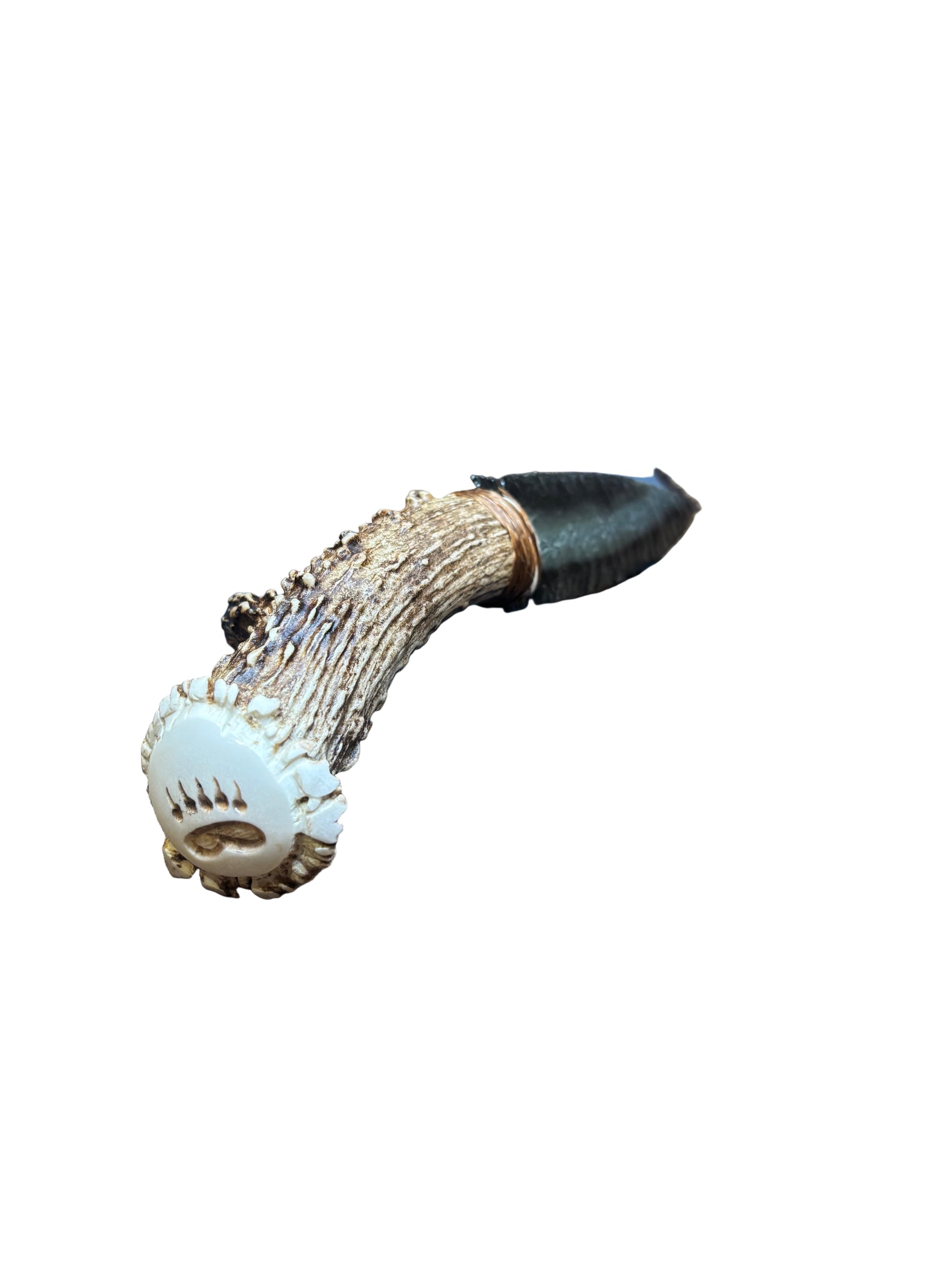 Designed and created by Dale Duby of Great Basin Art. These knives are flintnapped stone knives. Each knife is a one of a kind art piece and individually handcrafted from stone, antler and bone.