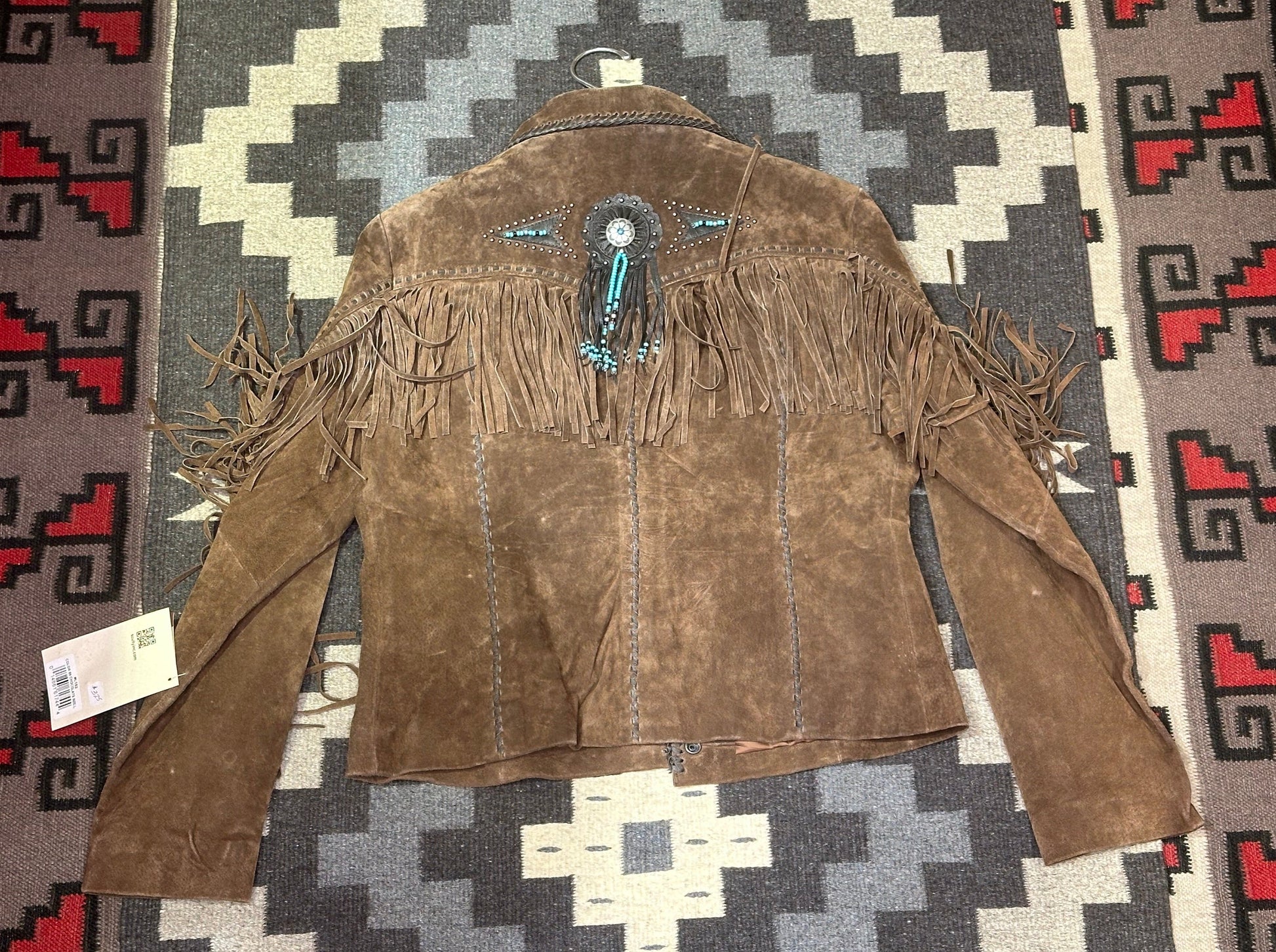 This classic western jacket has a flattering fit. It features fringe yokes front and back and down the sleeves. This Westen design features conchos with beaded fringes, stud and bead designs details.