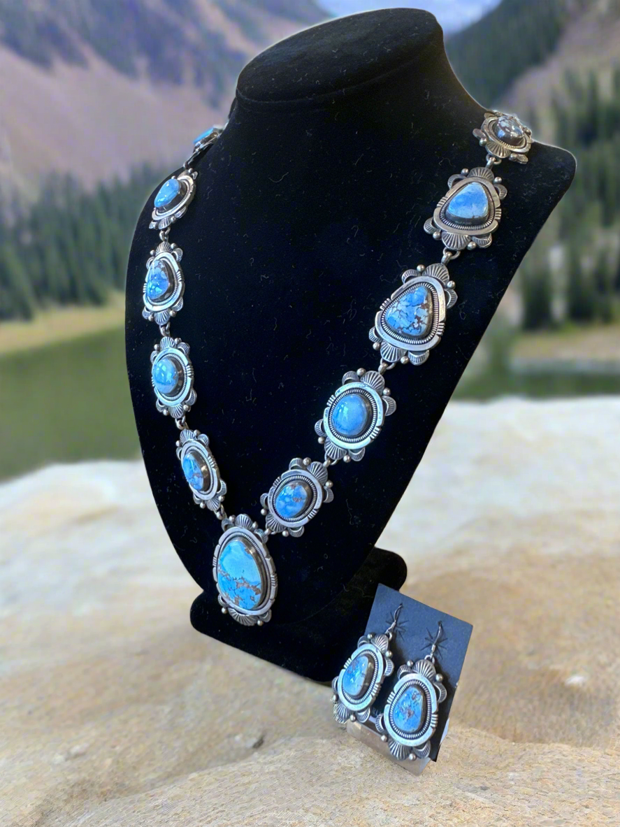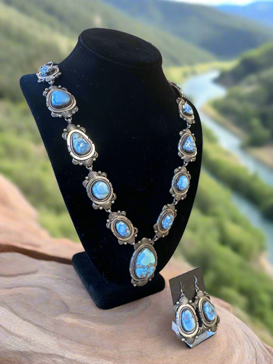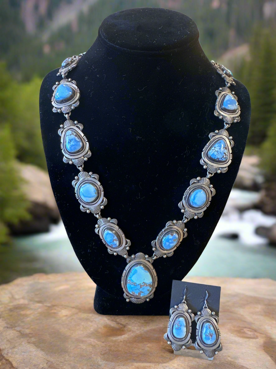 This stunning Golden Hills Squash Blossom set is perfect for adding a touch of elegance to any outfit. The set includes a necklace and matching earrings, both crafted from high-quality materials and featuring a delicate design. Elevate your style with this beautifully crafted set.