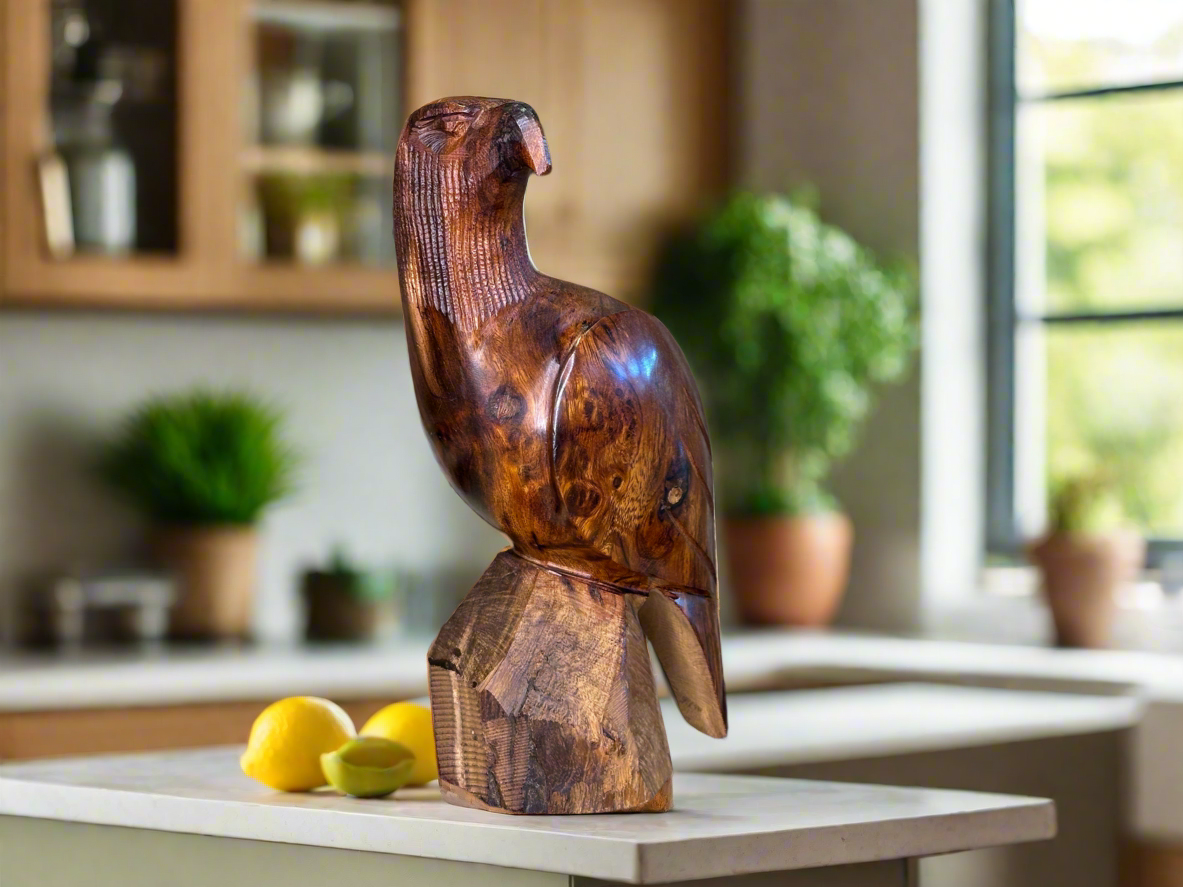 A unique Piece of art from the Sonoran Desert of Arizona and northern Mexico. It was handcrafted from desert Ironwood ( Olneya tesota ),  very dense and heavy wood of intriguing origin. To be suitable for carving the wood must be exposed to the extreme of the climate conditions that only exist in the desert. The government has restricted the harvesting of living ironwood trees. To preserve your art piece for years to come, polish with a soft cloth and occasionally apply a light coat of neutral pace type shoe wax.