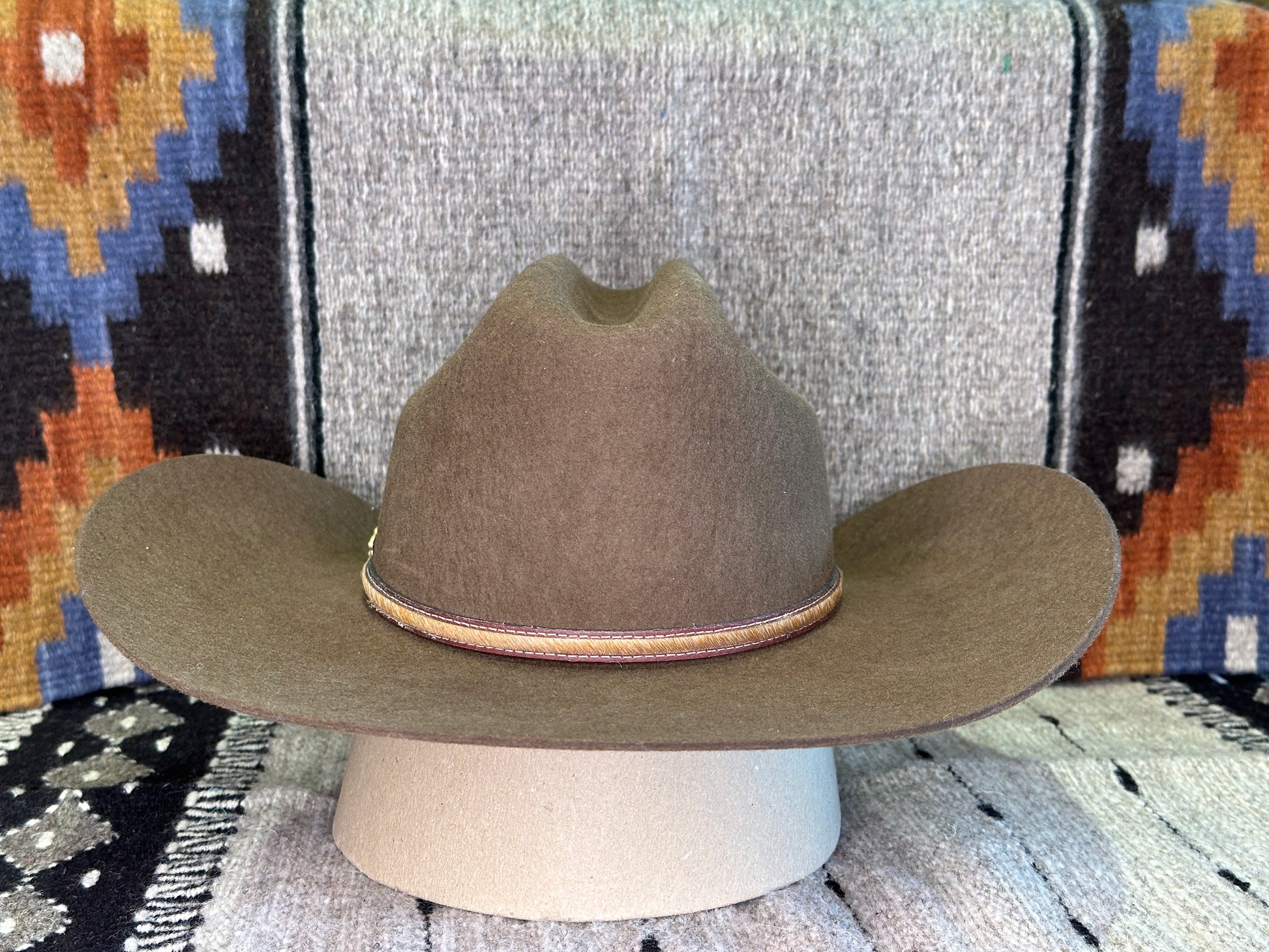 - Constructed with buffalo felt and featuring a leather sweatband, this hat boasts a brown leather band with a hair-on hide overlay, orange wraps, and antiqued gold-tone conchos. It is adorned with a Stetson buffalo hat tack, has a pinch front crease, and a satin crown lining. The brim measures 4 inches, and the crown stands at 4 3/4 inches. This handcrafted piece is made in the USA.