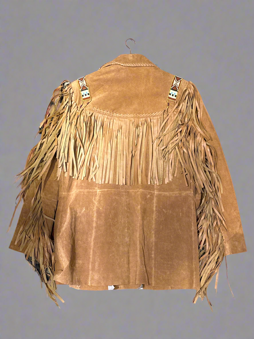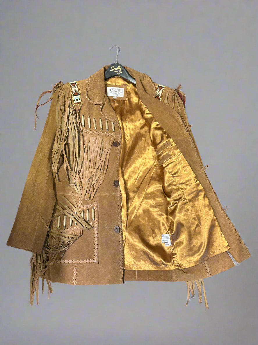 The Scully Leather Mens Bourbon Boar Suede Jacket is a stylish and unique fringe leather coat with intricate bone and bead detailing. Made from premium boar suede, this jacket features wooden bead accents on the yokes and pockets, as well as leather whipstitch lacing throughout. The long fringe on the yokes, shoulders, sleeves, and pockets adds a touch of Western charm. Stay warm and fashionable with this jacket, complete with two inside pockets and a comfortable acetate satin lining. Imported for the highest quality.